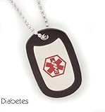 Dog Tag Necklace Includes a 24" Silver ball Chain. Stainless Steel Dog tag with black rubber on the outside for noise reduction. Medical symbol on the front side. "Diabetes" is engraved on the back side. Includes wallet card.