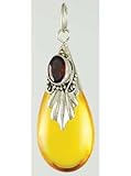 This amber drop pendant is decorated at the top with a sterling silver filigreed binding, decorated with a small Garnet stone. Coming with a jump ring for hanging it upon a chain or cord, it hanges approximately 1" long. The size, shape and color varies slightly with amber being an unexact product, produced by nature. List Price: Price: $ 10.70