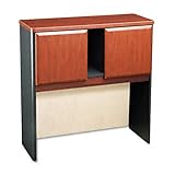 Contemporary laminate hutch makes a professional statement in any office. Vacu-form, vinyl-clad doors for added durability. Fabric-covered tackboard holds memos, notes and photos. Finished back panel adds privacy and allows hutch to be used as a divider between workstations. Self-closing adjustable hinges for precise operation. Narrow open center section for binders or files. Color(s): Galaxy; Hansen Cherry; Width: 36 in; Depth: 13 7/8 in; Height: 36 1/2 in.