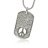 Here is a fun white gold plating crystal stud peace symbol dog tag necklace. The pendant measures approximately 1/2" wide and 1" long. It's the perfect way to bring a little glam to a casual outfit! Your necklace will come to you in a foil gift box great for gift giving. Box may be a different color than the one shown.